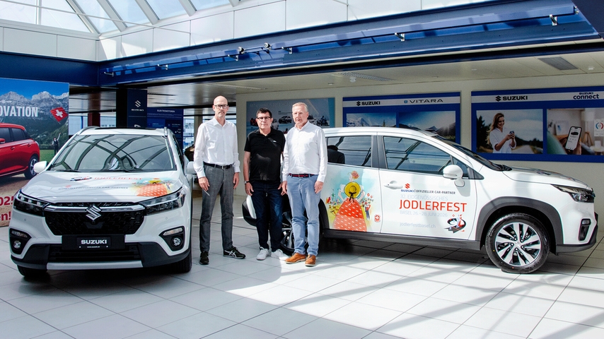 Mobilité pour l'équipe du comité d'organisation - Dans le cadre de ce partenariat, Stefan Gass, directeur général de SUZUKI Schweiz AG, a remis trois nouvelles SUZUKI S-CROSS au comité d'organisation de la Fête fédérale de yodel à l'Autocenter Safenwil. Les véhicules, recouverts d'un film adhésif voyant, sont à la disposition de l'équipe du comité d'organisation pour la planification, la coordination et l'organisation de ce grand événement. Ils servent également d'ambassadeurs mobiles et de supports publicitaires accrocheurs pour la fête à venir, qui aura lieu à Bâle à la fin du mois de juin 2026.
